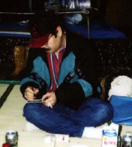 このあとは、もはやイベントでは恒例となった、ポラロイドを使って2ショット撮影大会。今回、会長さんは金儲けをやりませんでした(^^;;。写真を撮った後は、皆さんあちこちでいろんな話題で盛り上がったようです。そういえば、さっきまで降っていた雨で地面が濡れてましたが、下に敷いてるシートを通して水がしみてきた人がいる様子。松本さん、もっとやせなきゃ(^^;;。