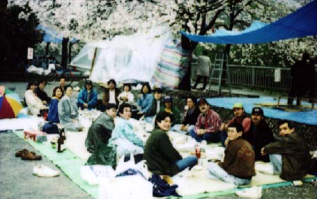 さてさて、今回のお花見はFC会員のKさんが仕出し屋さんを始めたそうで、食べ物,飲み物は全部そろえてくださいました。しかも特別価格で(?)。みんなでお礼を言っておきましょう。「ありがとう!(_o_)」。